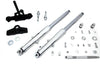 Adjustable hard chrome fork tube assembly with polished sliders. Hard chrome 41mm adjustable fork tube assembly with polished sliders includes black adjustable rake triple tree set. Internals installed stainless slider covers axle and nut fork bearings and cone nut included. Unit accepts left side brake kit riser bushing set and top tree cover which place riser stems 3-1/2 inch center to center sold separately.