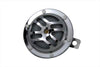 Round horn includes chrome strap and bracket. Horn is 12 volt style and measures 4 inch outer diameter with chrome finish.