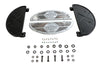 Black driver half moon footboard set features deluxe chrome footboard inserts. Includes screws and nyloc nuts to mount inserts and parkerized footboard mount kit. Mounting bracket features 10 inch spacing. *NOTE: Drilling of 4 holes in boards for mounting of inserts may be required.