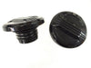 Air flow gas cap set features a black finish with screw in type caps. Set includes one vented and one non-vented with a raised center portion with machined reliefs. *NOTE: Features plastic construction.