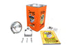 Assembly includes chrome 12 volt Spring Fork headlamp and replica chrome bracket with mount bolts. Kit is packaged in a 5 gallon Oilzum can.