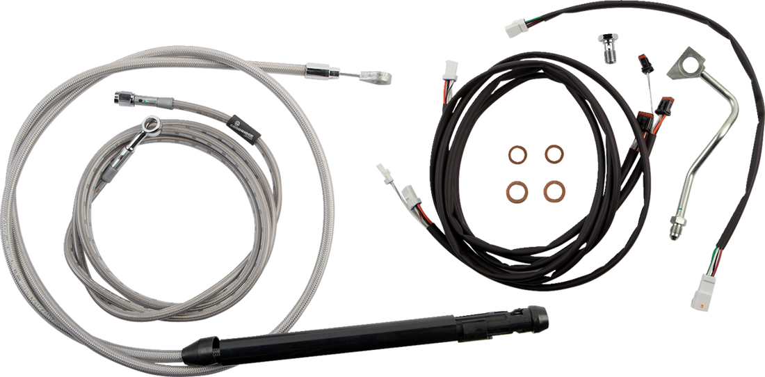 Includes everything you'll need to install your handlebars: clutch cable, brake line, extension kit for main harness, shrink tubing & extension kit for Throttle-By-Wire, Intended for use with standard 2" risers., Some ABS models use stock brake line.
