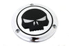 3-hole derby cover features a chrome finish with a skull design.