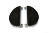 Made of stamped steel these half moon shaped footboards have a chrome finish with black rubber mats and a smooth underside. NOTE: Footboards have a flat profile edge. Footboards will fit stock mounting brackets on a 1940-1984 FL. Mounting bracket features 10 inch spacing. Sold as a pair. Boards are for replacement or custom not for restoration. Bullseye pads are attached with adhesive.