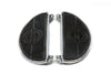 Chrome driver half moon footboard set features rolled edges as original for the authentic look. Pads are fastened with glue. Set of two. This footboard set can also be used on 1966-1984 FL models. Includes rubber pads with logo must be set in place with adhesive. Holes for rivets are pre-drilled in the boards if rivets are so desired. Mounting bracket features 9-3/4 inch spacing.